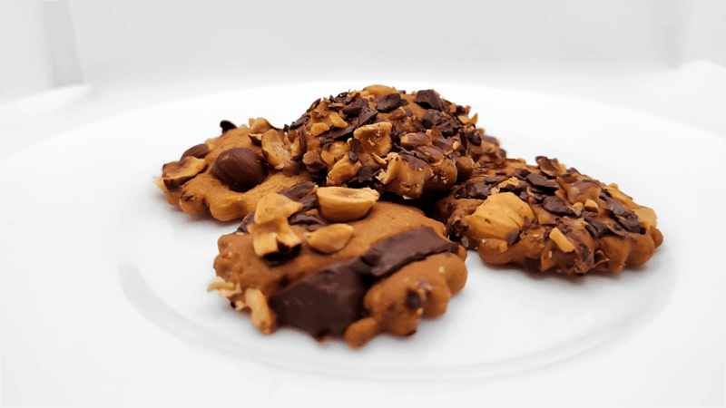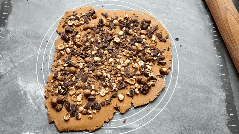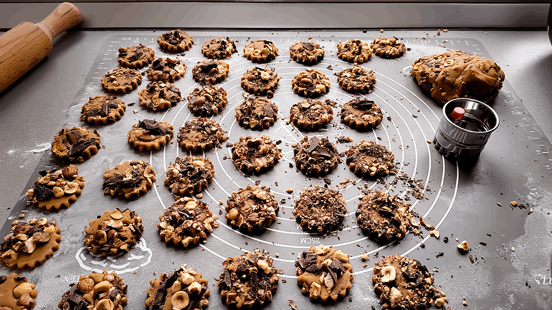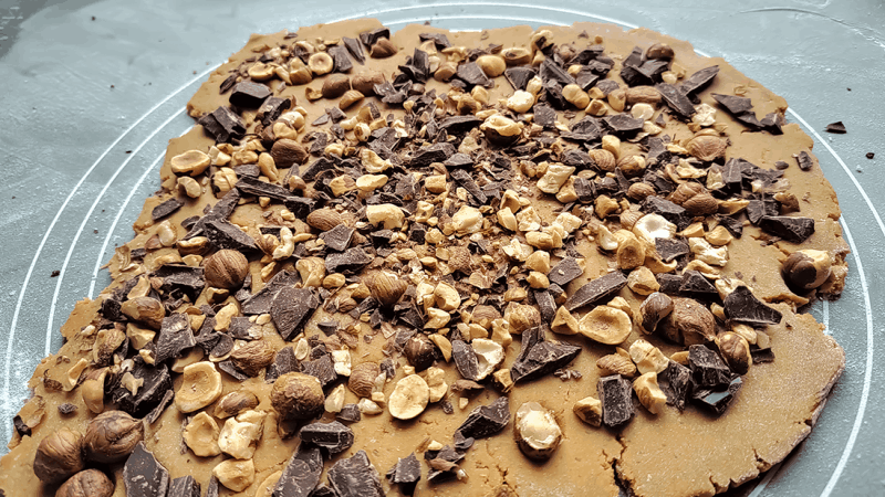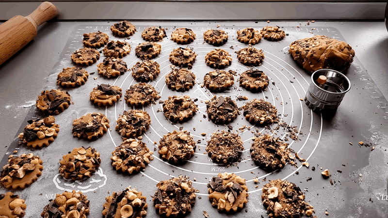 Pentru compactare se frământă aluatul timp 2-3 minute după care se întinde până se obține o grosime a blatului de 5-6 mm. Blatul obținut se decorează cu alunele de pădure și ciocolata zdrobită iar ulterior se decupează în forme dorite (rotund, formă de stea, etc.).